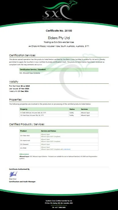 DJ’s has its own exclusive range of fertilisers designed for local conditions. We have designed a range of certified organic and conventional products that we use and recommend for tough problems including low yields and a build up of high soil salinity.